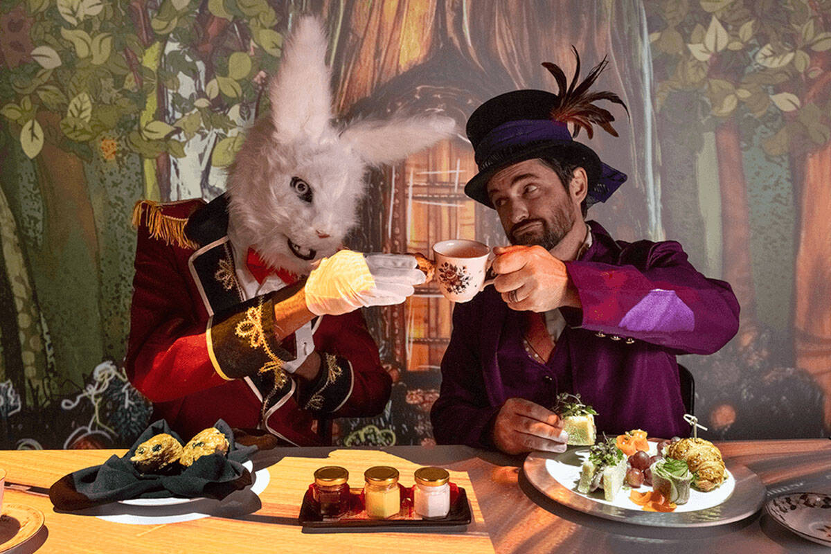 エレクトリックプレイハウスが手掛ける「ワンダーランドのティータイム」では、ホワイトラビットとマッドハターがゲストを「アリス・イン・ワンダーランド」の世界へと導きます。