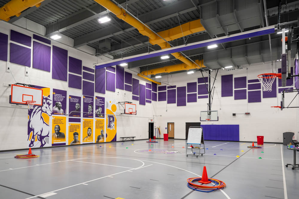 学校のデザインには、地域住民を迎えるための新しいデザインの側面が強調されています。 それが、ダラススカイラインの大きな壁画や、学校の紫と金の色、そして公園を見渡す床から天井までの窓です。