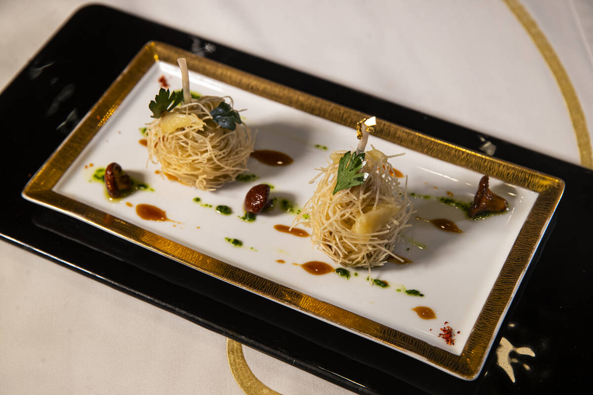 ラトリエの9皿の記念日テイスティングメニューは255ドル(ワインのペアリングはオプション)で提供され、予約はmgmgrand.comで可能である。