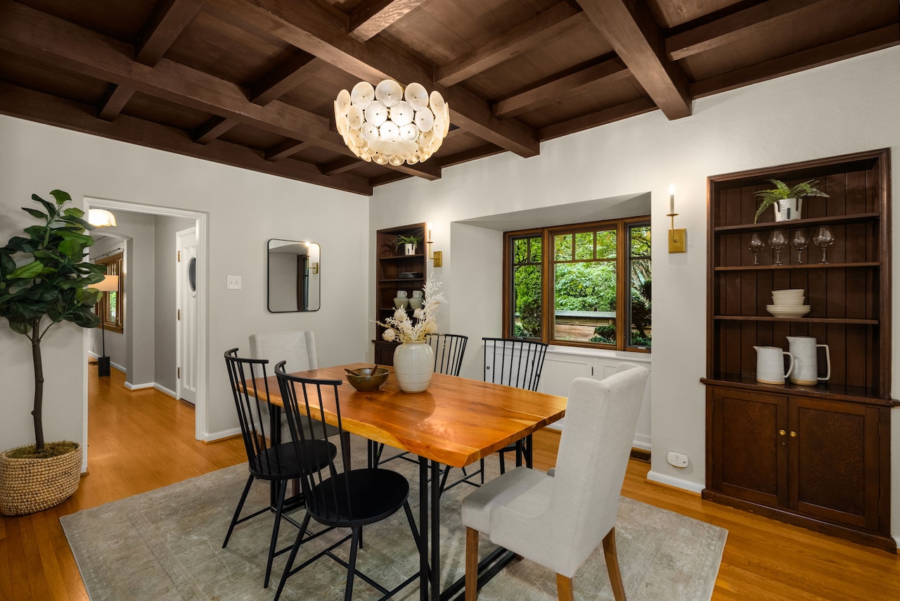 ダイニングルームには、スティンドボックスビームの天井があります。