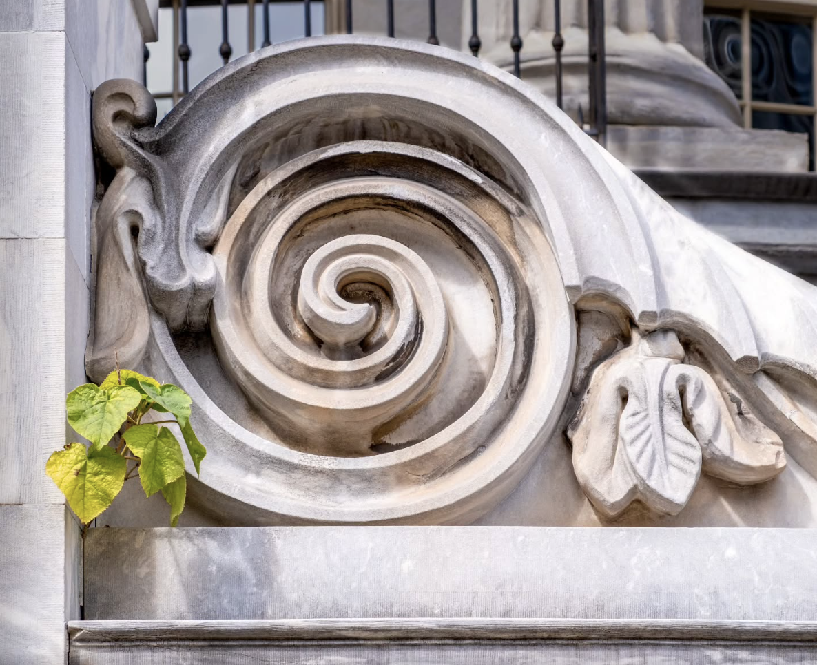 フィラデルフィアのマー チャントエクスチェンジビルでは、人工と自然の影響が混在する光景が広がっています。
