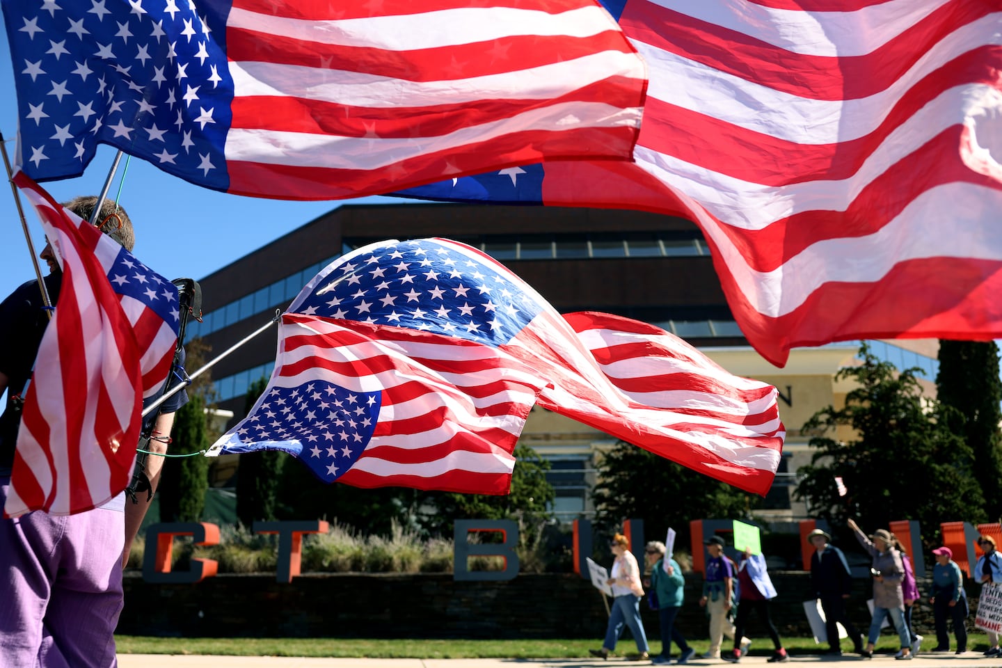 通りかかった車の中には支持の honkを送るものもあり、ゆっくりと様子を撮影するものもいた。アメリカの国旗を持つ抗議者がいて、小さなグループは自由の女神の衣装を着ていた。