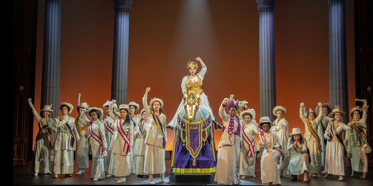 ポール・タズウェルの衣装も、象徴的な白いドレスと参政権のサッシュにより、シンプルな舞台写真を歴史の見える衝撃に変えています。