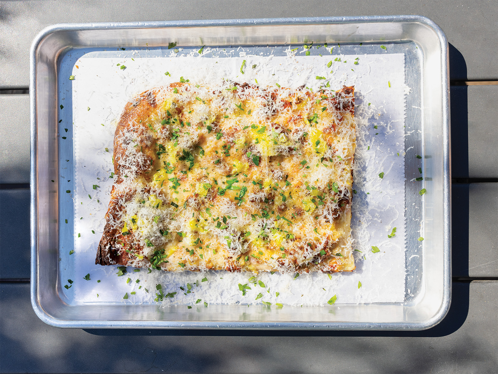 ピザはデュリンが再びセイボリーな面に全力を注いだ成果で、店では大きな四角いスライスが提供される。