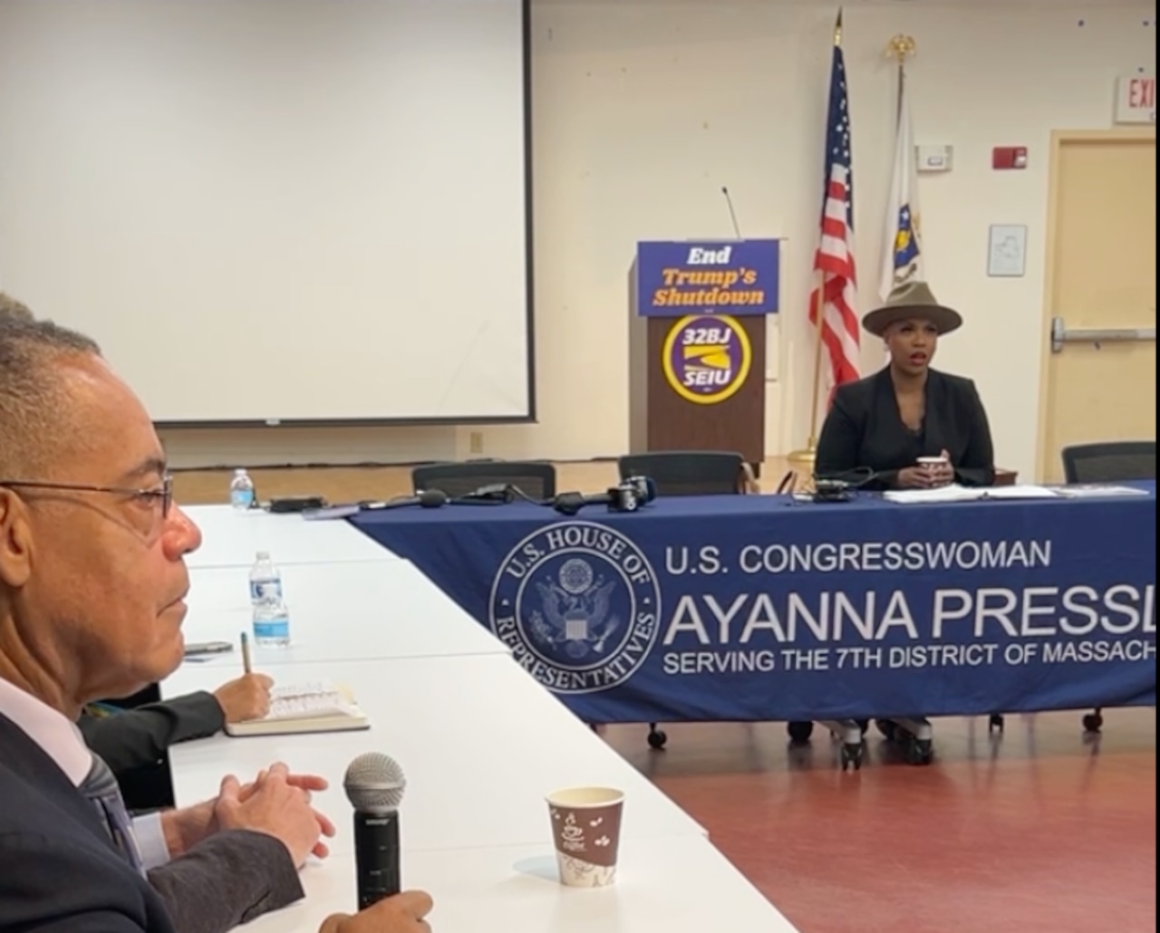 金曜日、ボストンでプレスリーは、連邦契約労働者のための未払いのために新たに法案を再提出することを発表しました。