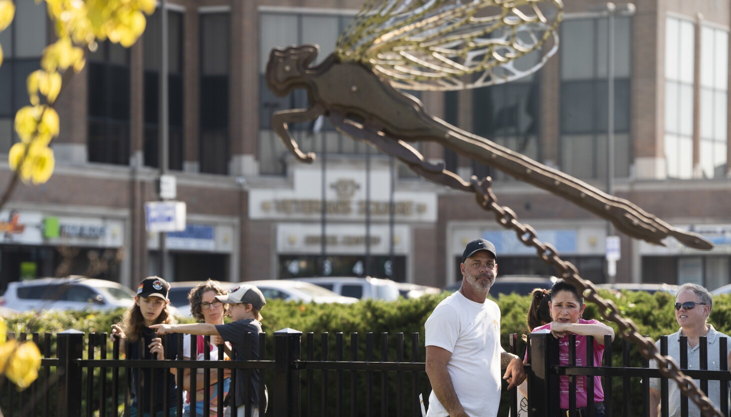 ジェファーソンパーク交通センターでバスを待っていると、岩の上に鎖で繋がれた8フィートのトンボを見ることができるだろう。