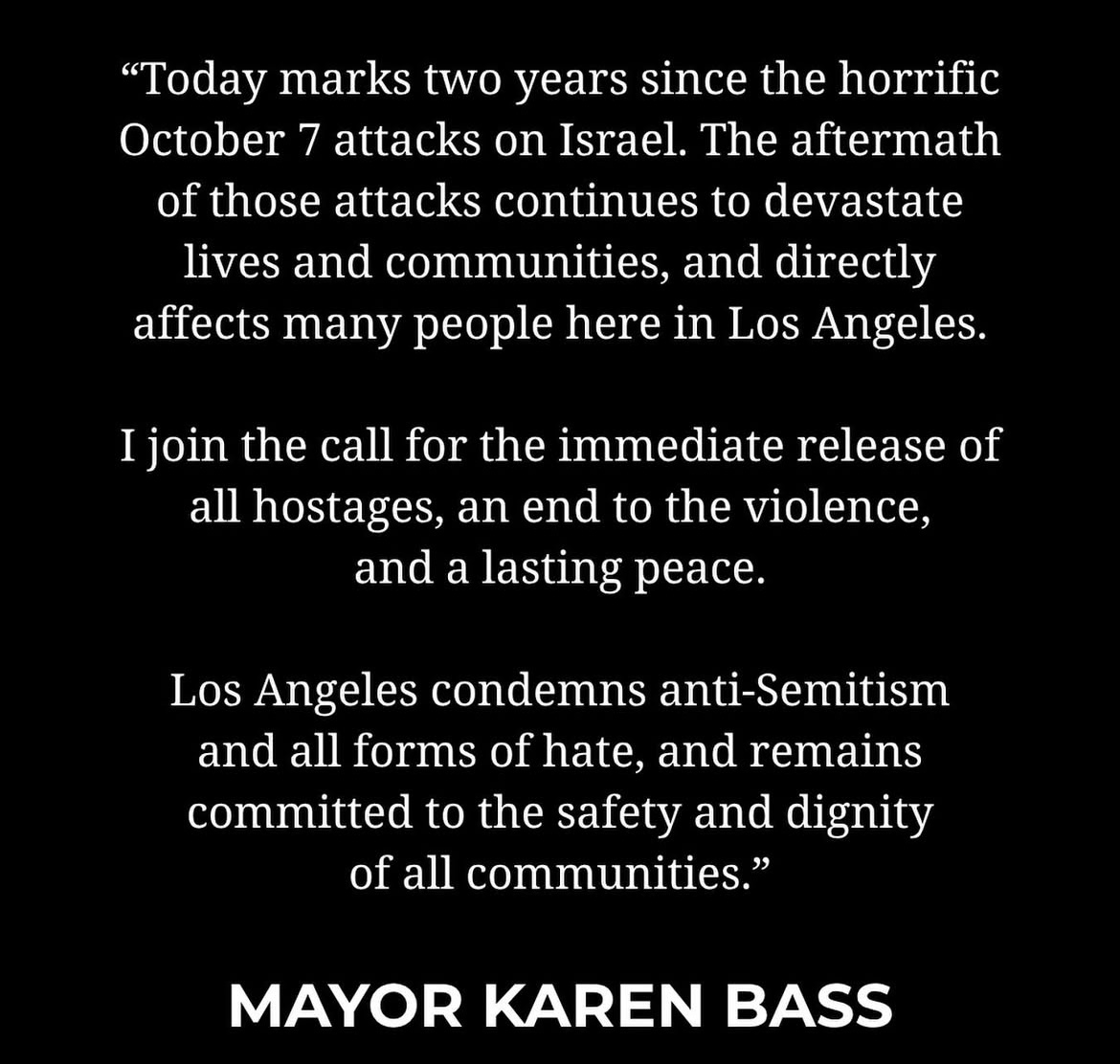「私は、すべての人質の即時解放、暴力の終息、そして持続的な平和を求める声に加わります。ロサンゼルスは反ユダヤ主義とあらゆる形の憎悪を非難し、すべてのコミュニティの安全と尊厳を守ることを約束します。」