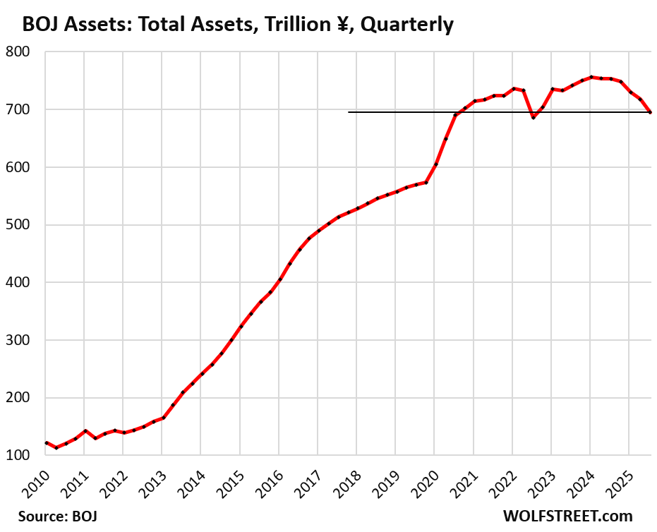 日本銀行(BOJ)は、量的引き締めをさらに加速させており、2024年9月までの四半期において総資産が22.3兆円(1480億ドル)減少しました。これは、量的引き締めが始まった2024年の初め以来、最大の四半期あたりの減少幅です。