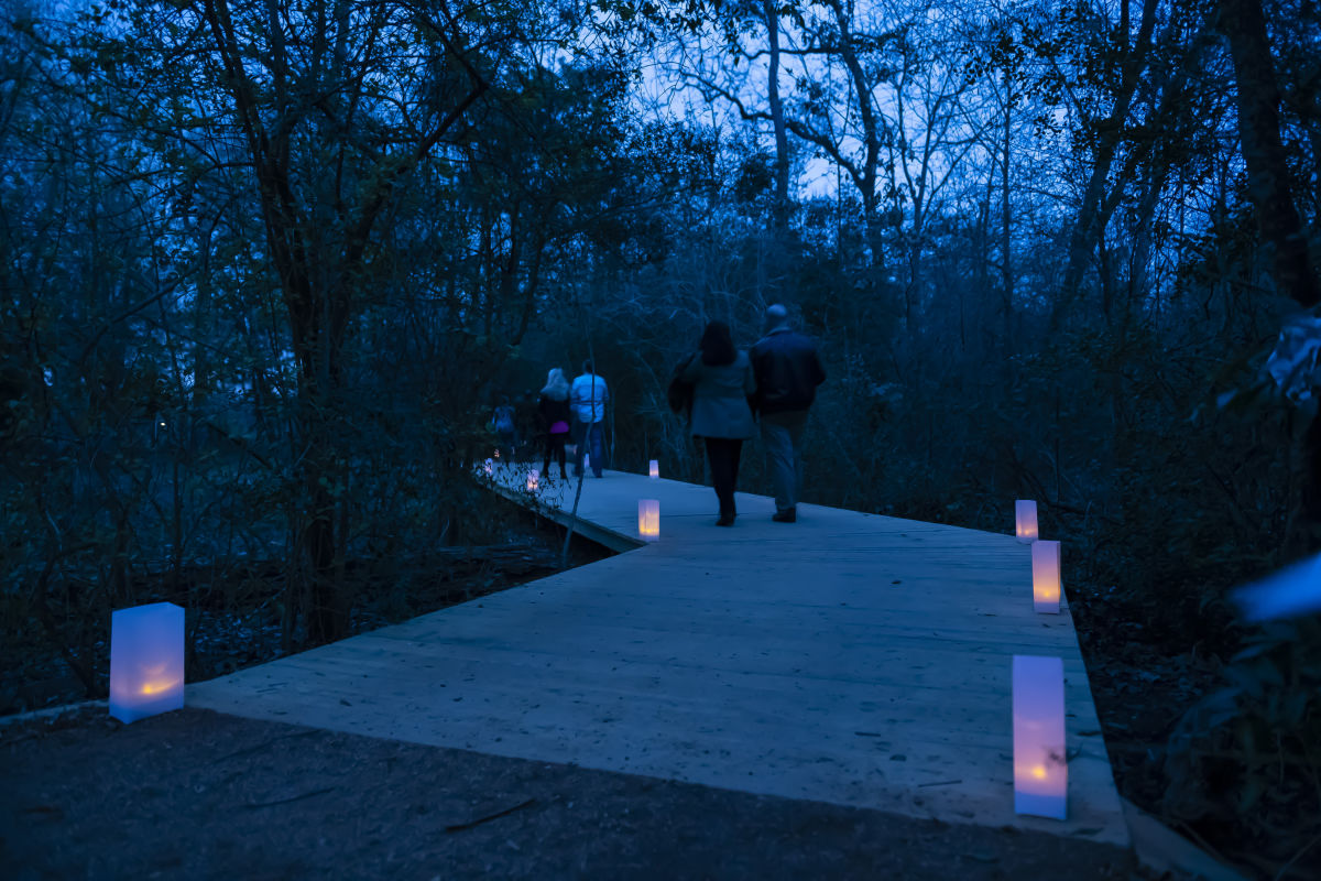 訪問者は、ジョン・ジェイコブ展望塔からヒューストンの360度の景色を楽しむことができる一方、日中は飾られたトレイルを散策することも可能です。