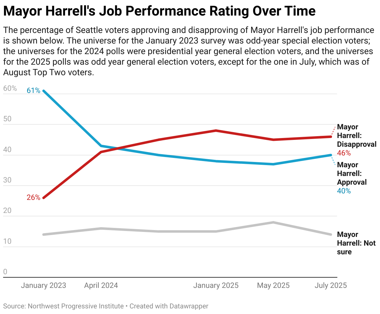 我々の最初の選挙後のシアトル調査によると、2021年クラスの現職は市民から良好な評価を得ていました。特に市長の支持率は非常に高く、彼の「ハネムーン」は終わっていませんでした。しかし2023年が進むにつれ、有権者の忍耐は次第に尽きていきました。