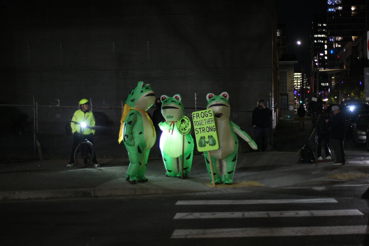 その晩、私たちの報道陣が数えたところ、フロッグ、ユニコーン、ホッキョクグマ、アホロートル、アライグマ、孔雀、サメ、猫など、100人以上の人々が動物のコスチュームを着て参加していました。