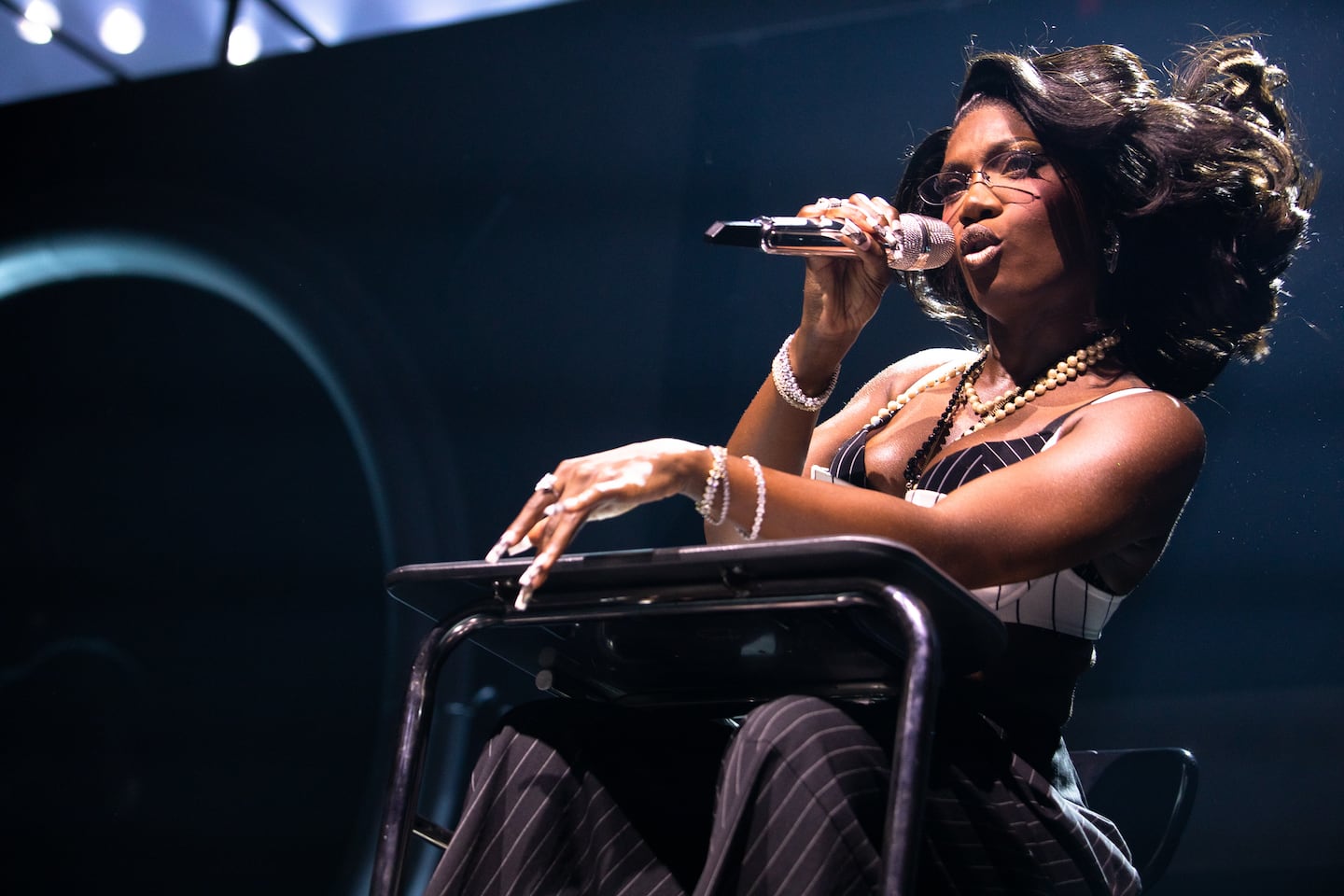 演奏中、彼女は観客の近くで迫力あるライミングを披露し、そのアートの強度を示しました。