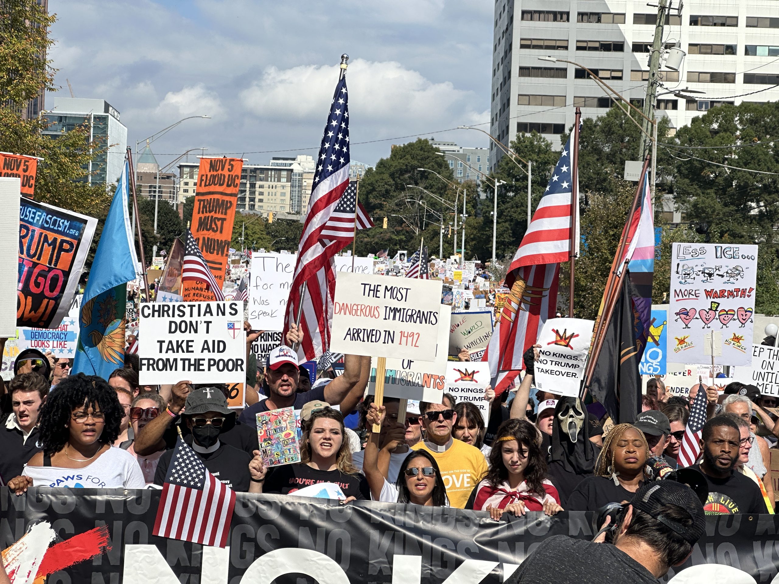 土曜日にアトランタ市民センターに数千人が集まり、ダウンタウンを通って州議事堂まで行進しました。これは、アトランタの2回目の「ノー・キングス」集会であり、参加者たちは自分たちの自由な言論権を行使することを恐れず、地元の指導者にも同様の姿勢を求めました。