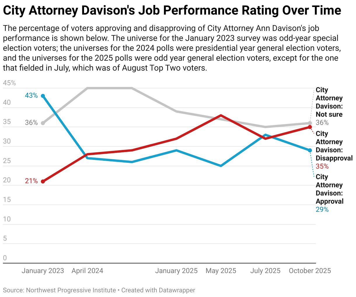 シアトル市の有権者の大半が、現職のシアトル市検事アン・デイビソンを挑戦者のエリカ・エバンスと交代させる準備ができているとの新たな調査結果が示されています。この調査は、ノースウェスト進歩主義研究所のために今週行われたシビック・ハートビートの世論調査によるものです。