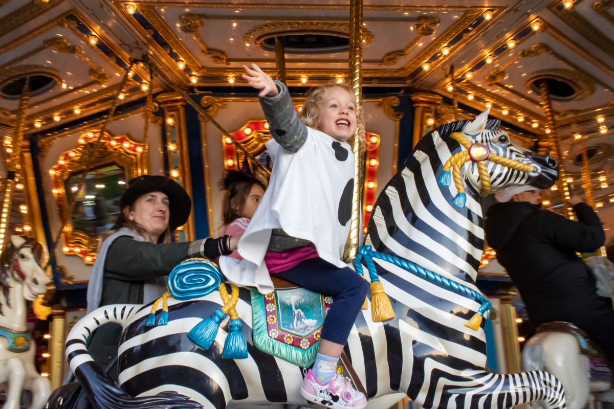 ドラゴンやカボチャ、プリンセスに扮した子供たちがメリーゴーランドからゾンビ迷路まで駆け回り、楽しいアクティビティの長い列に並ぶために急いでいました。