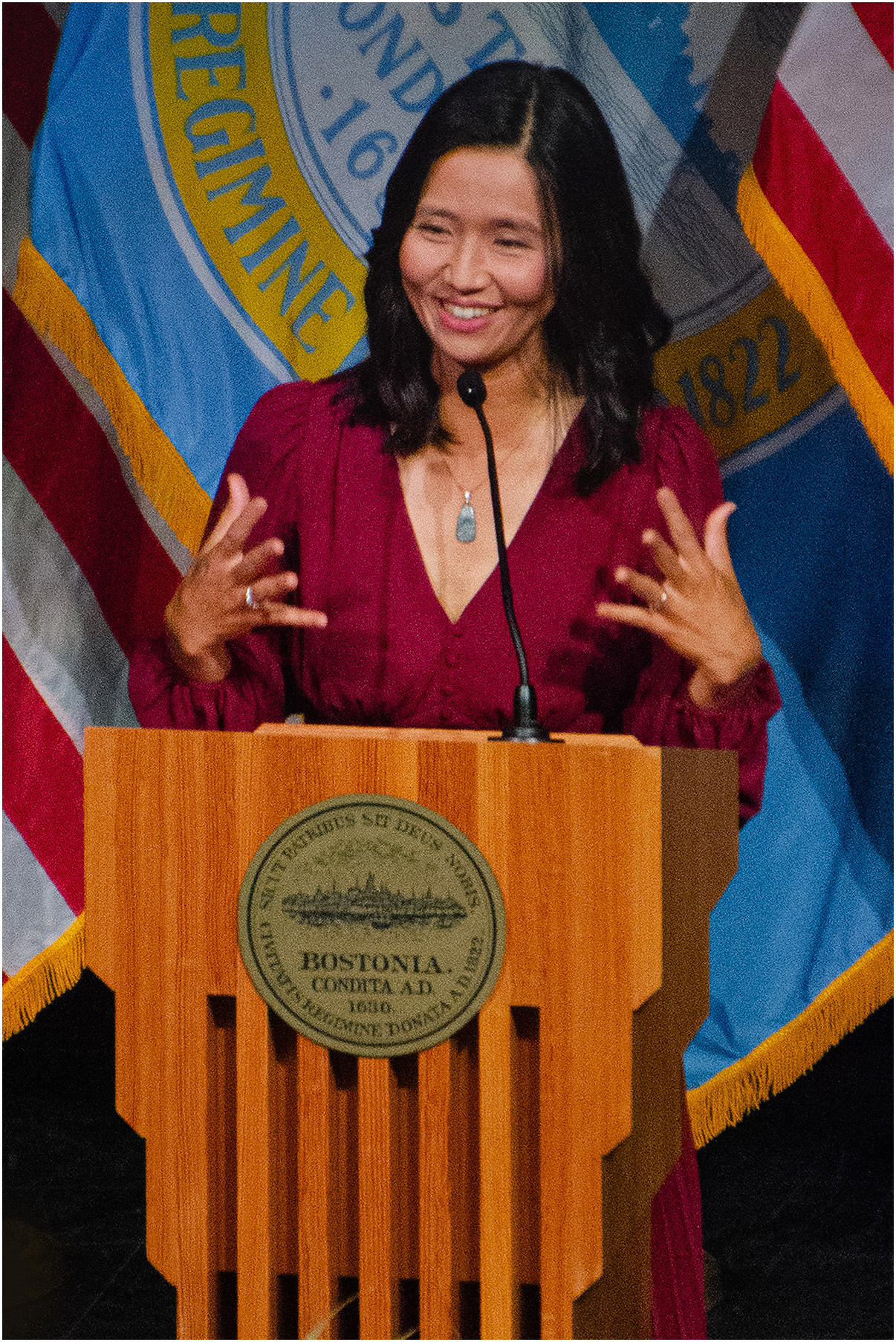 演説の舞台となった中国街のジョサイア・クインシー中高等学校の435席の講堂は、最近の「市の現状」演説の会場よりも小さい。それでもこの学校は、より良い教育を求める数十年の地域の取り組みに根ざしており、昨年オープンした新しい六階建ての建物は、近代化と可能性の象徴であり、その講堂の天井には光の点が散りばめられている。